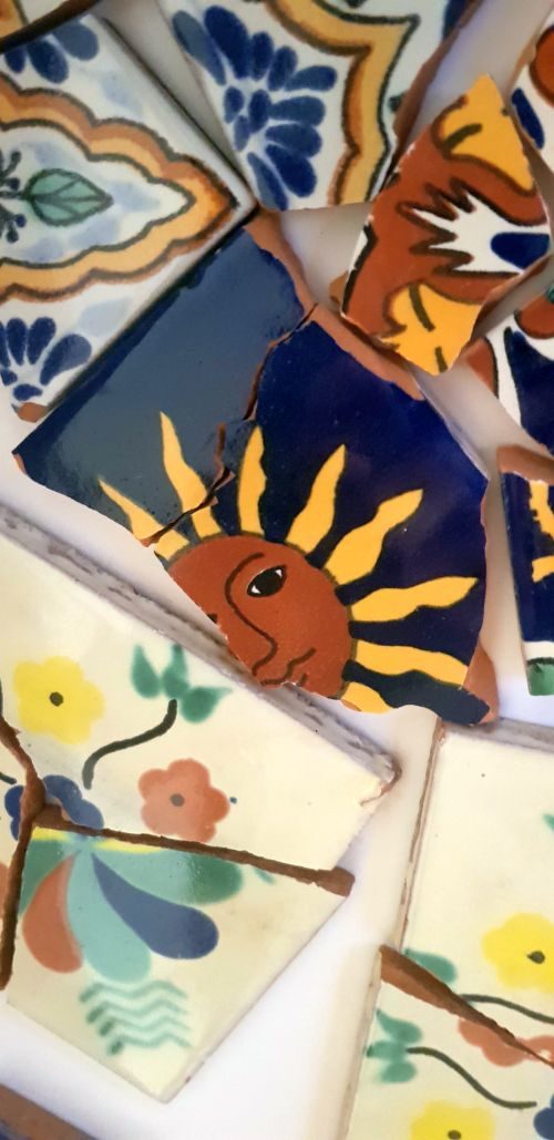 Da stiess ich auf Mosaik-Fliesen und dies hatte super funktioniert. Der Profi, der dies im Anschluss abnahm, war begeistert. Mit den Resten habe ich dann einem Bistro-Tisch eine neue Platte beschert. Danach war ich total auf dieses angefixt und suchte neue Objekte. Beim Recherchieren im Internet fand ich eine Seite über einen Händler, der mexikanische Fliesen verkauft. Wer dies kennt, weiss, dass diese nicht ganz günstig sind, da jede Fliese handbemalt ist. Sie sind wunderschön, aber eben, sehr teuer. Im Angebot hat diese Firma auch Bruch-Mosaik, natürlich günstiger. Und so bestellte ich mir erstmal fünf Kilo Bruch-Mosaik.